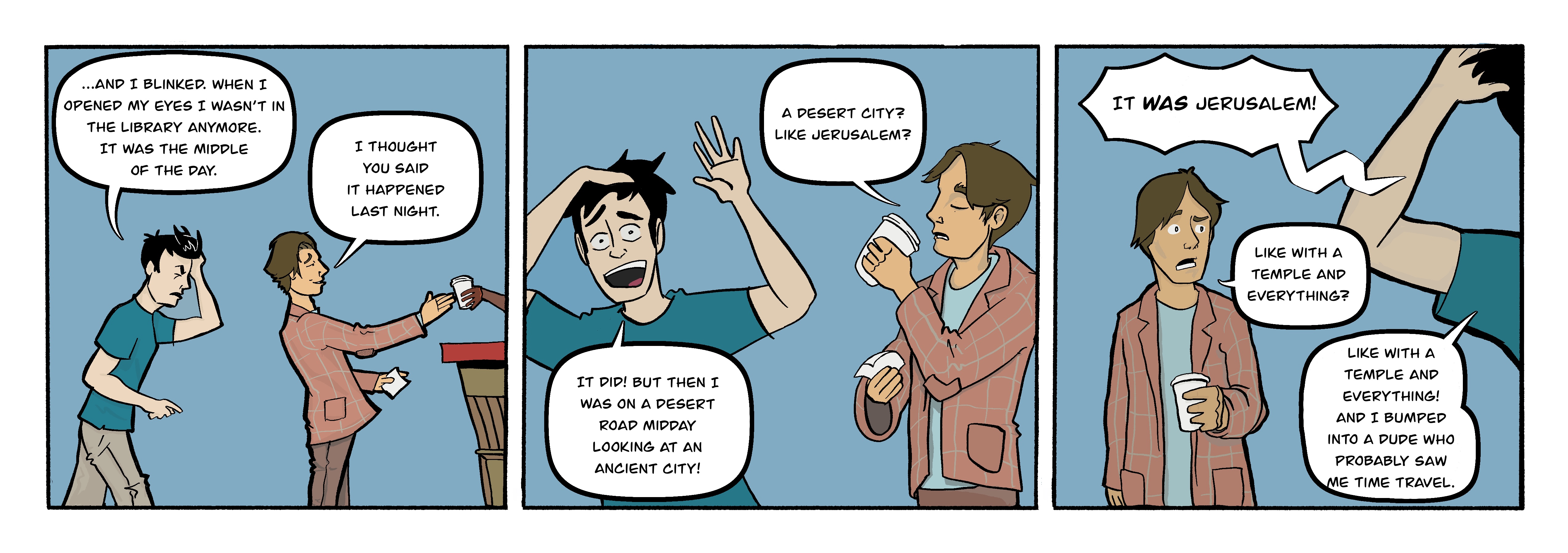 I have to say, that even drawing a completely fictitious comic strip that takes place in “the real world” that going to The Holy Land has really given some incredible scale to my imagination. It’s amazing at how one can see how relatively small the places that Our Lord saw and encountered, as well as the lands that Moses and the Israelites traversed. It’s also possible to see how big they would have been to someone who travelled primarily on foot. Perhaps we’ll get to explore these locales a bit here. Maybe we’ll visit the temple (and everything)!