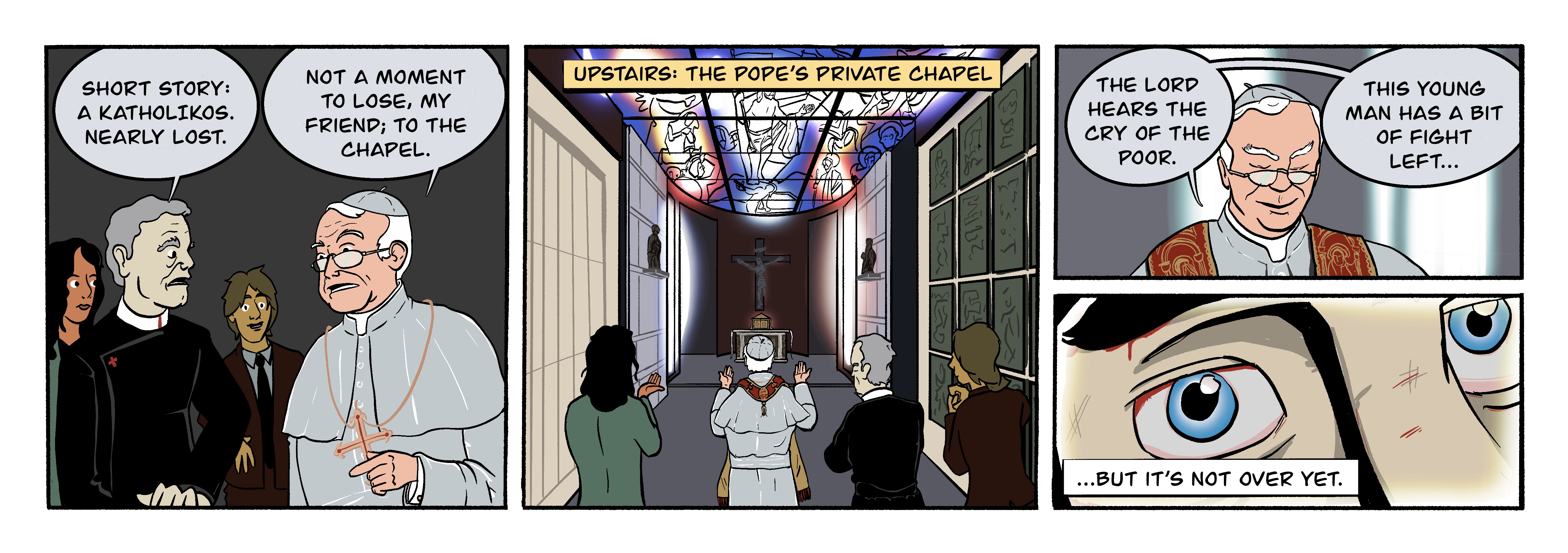 This is a close approximation of the pope’s private chapel in the Apostolic Palace. After drawing it, it occurred to me that they would likely choose another chapel in the “basement” of a place you’ll learn about later. But, the deed was drawn, so they just went upstairs!
